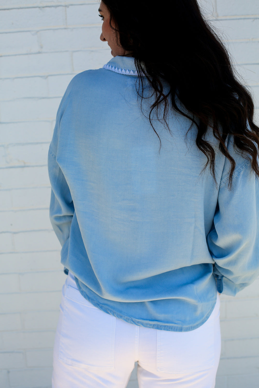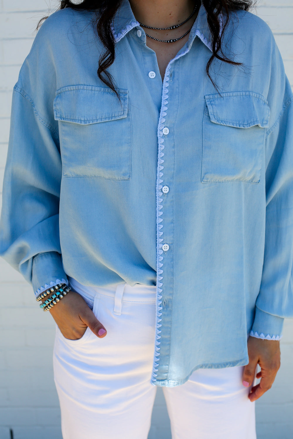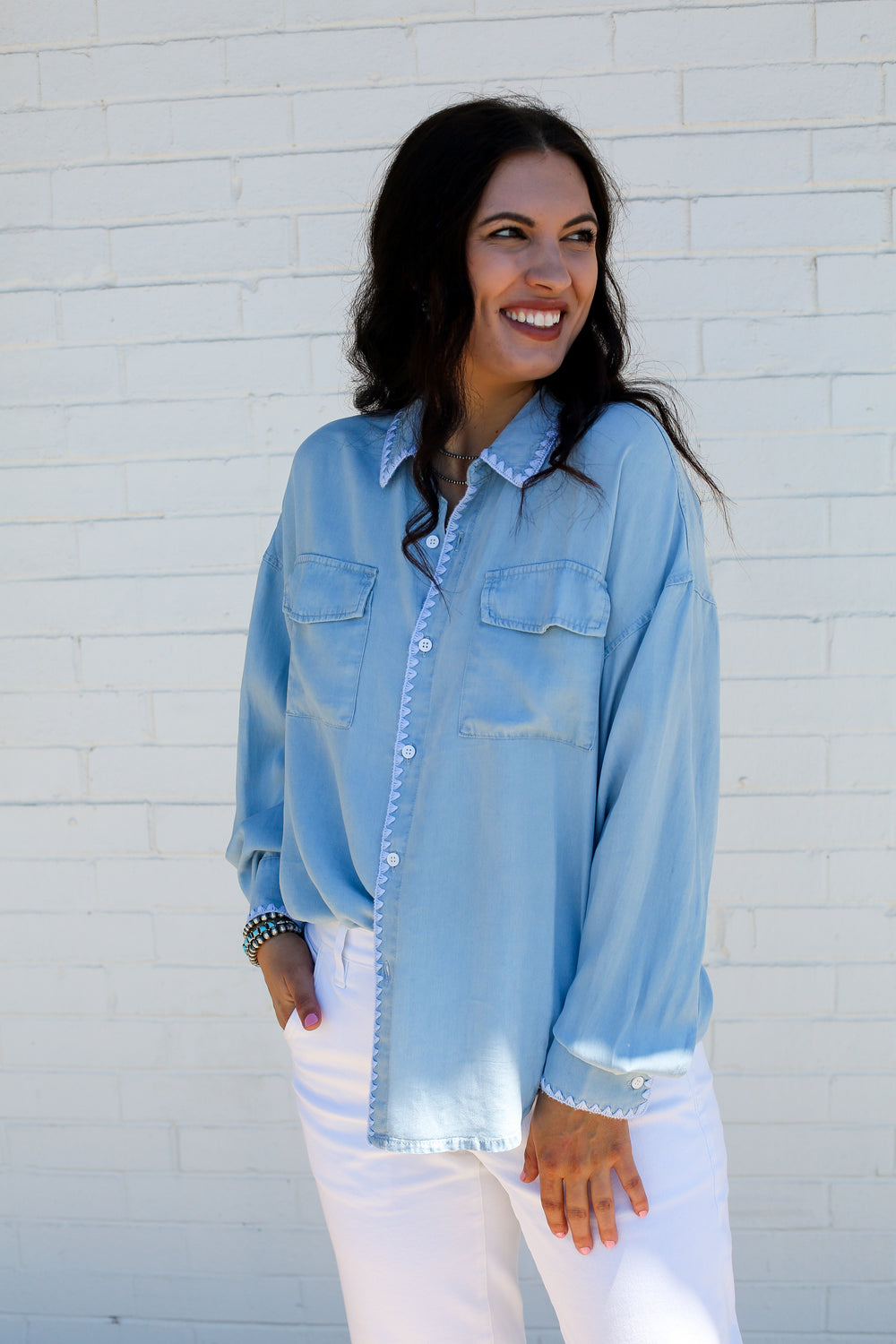 This stylish button-down shirt features exquisite detailing along the button line and is perfect for any occasion.