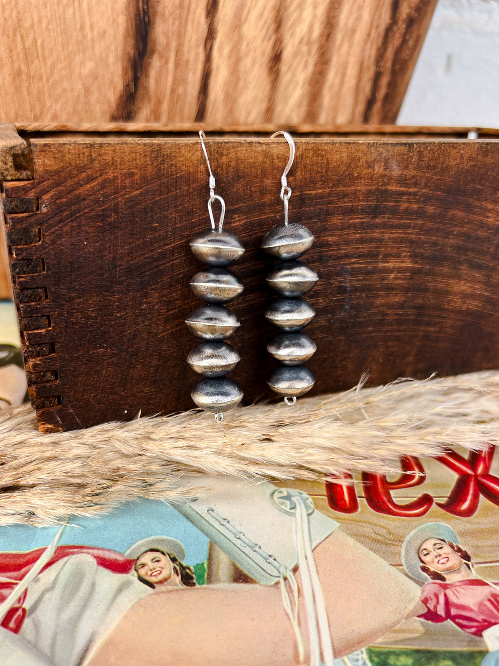 Experience the beauty and versatility of our Navajo Pearl Saucer Line Earrings, measuring 3 1/2 inches from top to bottom. Add a touch of elegance to your style with these stunning earrings.
