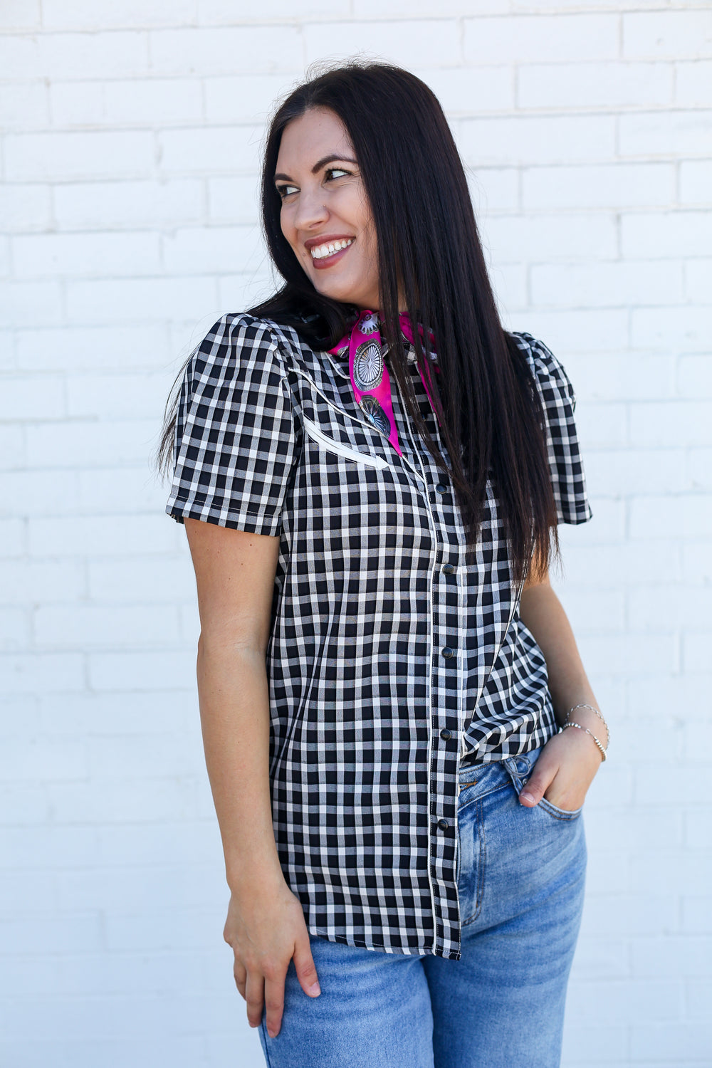 ELEVATE your style game with our stunning BLACK GINGHAM Pearl Snap top! This PRINTED SHORT SLEEVE PUFF top adds a playful touch to any outfit, guaranteed to make you feel confident and stylish. Don't miss out on this must-have piece that will elevate your wardrobe and make heads turn.