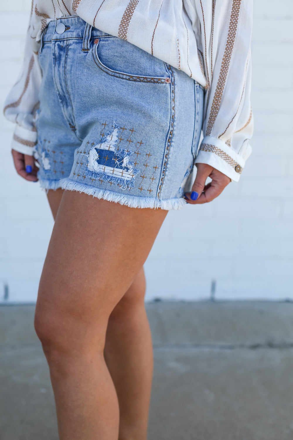 Introducing the Dear John Carrie Denim Shorts Sedona: with adorable brown stitching detail, these shorts are sure to become your new go-to!
