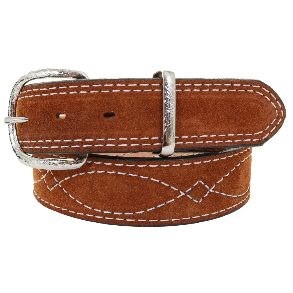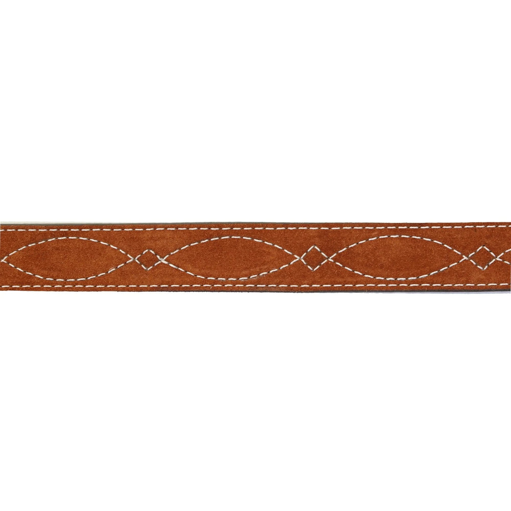 Traditional straight belt with white stitching and silver hardware. Belt measures 1 and 1/2 inches wide and comes in multiple sizes that are true to size. Made of quality leather and suede material.
