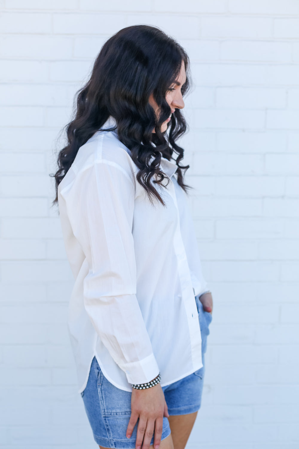 Introducing the Polly Perfect White Button Up - the shirt of your dreams! Its pure white color and classic button up design will have you feeling confident and stylish all day long. A must-have for any wardrobe, this shirt will effortlessly elevate any outfit.