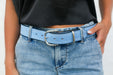 Traditional straight belt with white stitching and silver hardware. Belt measures 1 and 1/2 inches wide and comes in multiple sizes that are true to size. Made of quality leather and suede material.