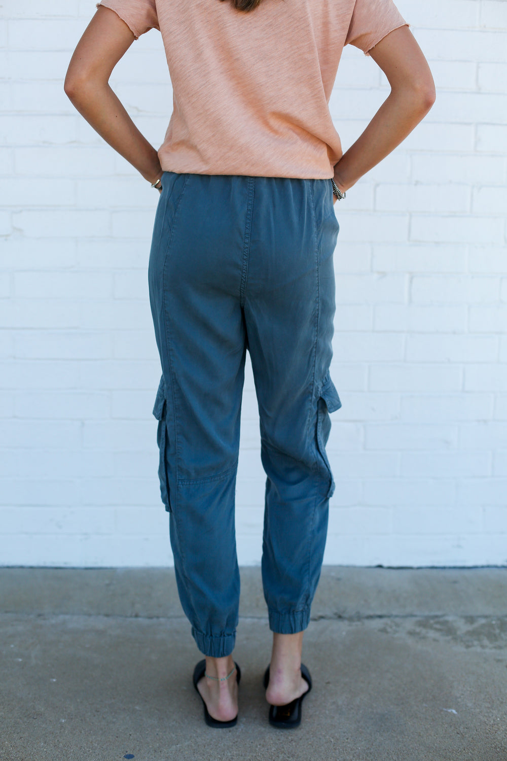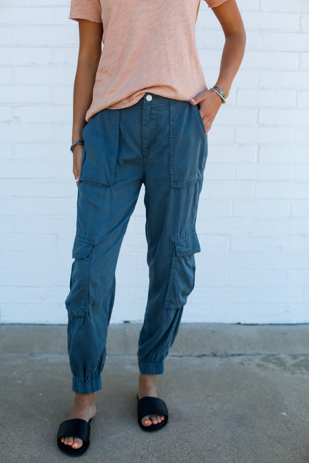 The go-to piece for utility is high rise cargo cropped joggers in chic charcoal. These versatile pants are designed to offer both style and functionality with their high-rise fit, providing a flattering silhouette for any body type. The elastic hem adds a thoughtful touch and ensures a snug fit around the ankles, perfect for showcasing your favorite footwear. Made entirely from eco-friendly 100% TENCELª, not only boast a luxurious feel but are also a sustainable choice for comfortable clothing for women.