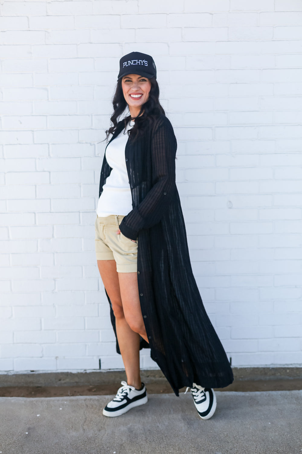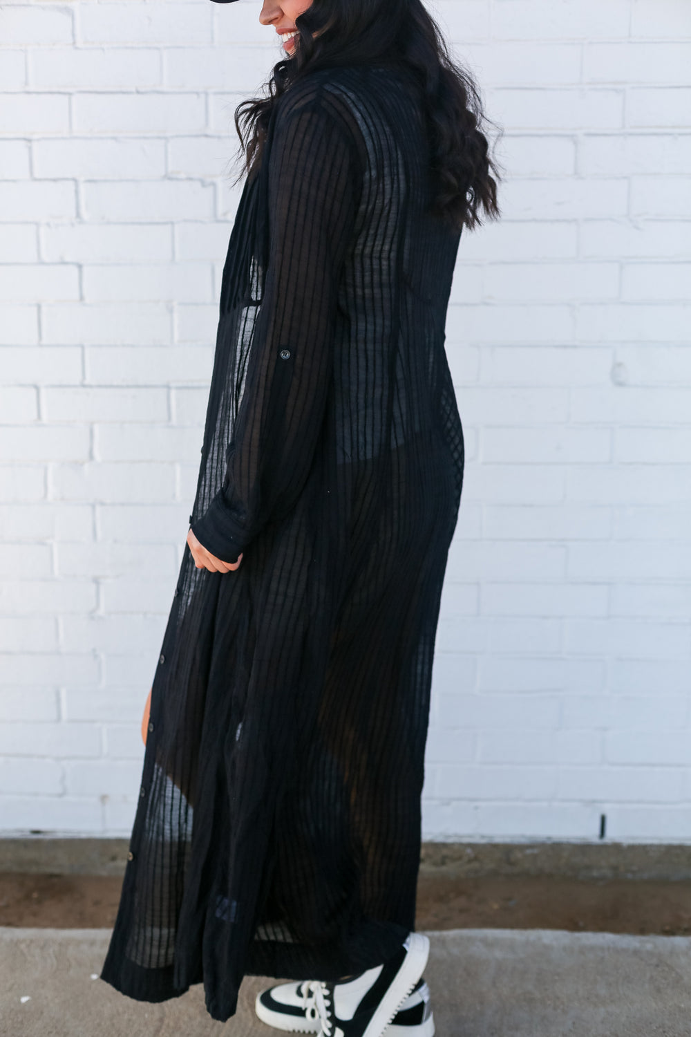 - Effortlessly stylish button down maxi dress - Long sleeves with buttoned cuffs for added flair - Convenient hidden side seam pockets - Clean hem adds a polished touch - Perfect for any occasion, wear as a maxi dress or open with denim shorts for a playful summer outfit
