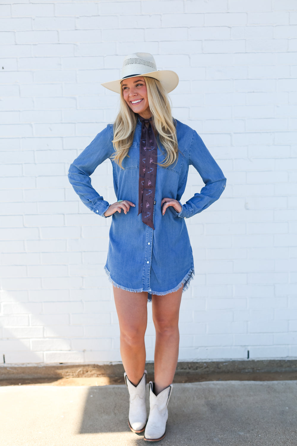 Experience effortless style with the AVERY DENIM DRESS. Featuring a button front, long sleeves with frayed cuffs and a hi-low hem, this mini dress exudes simplicity and versatility. Perfect for dressing up or down, the relaxed fit and solid color woven fabric make it an easy go-to choice for any occasion.