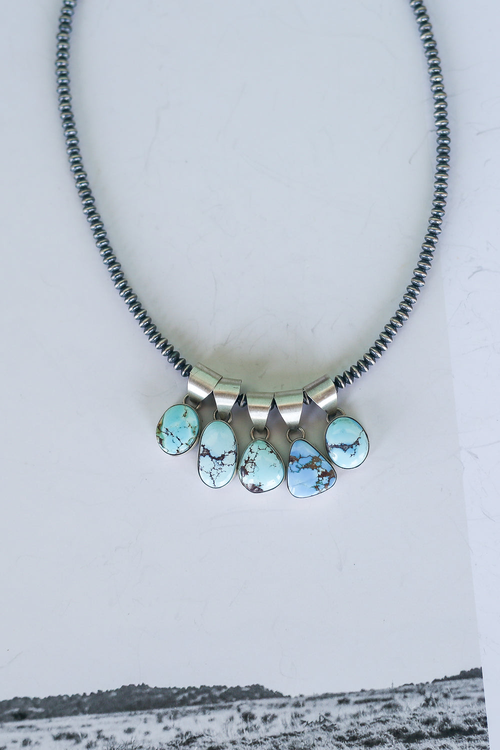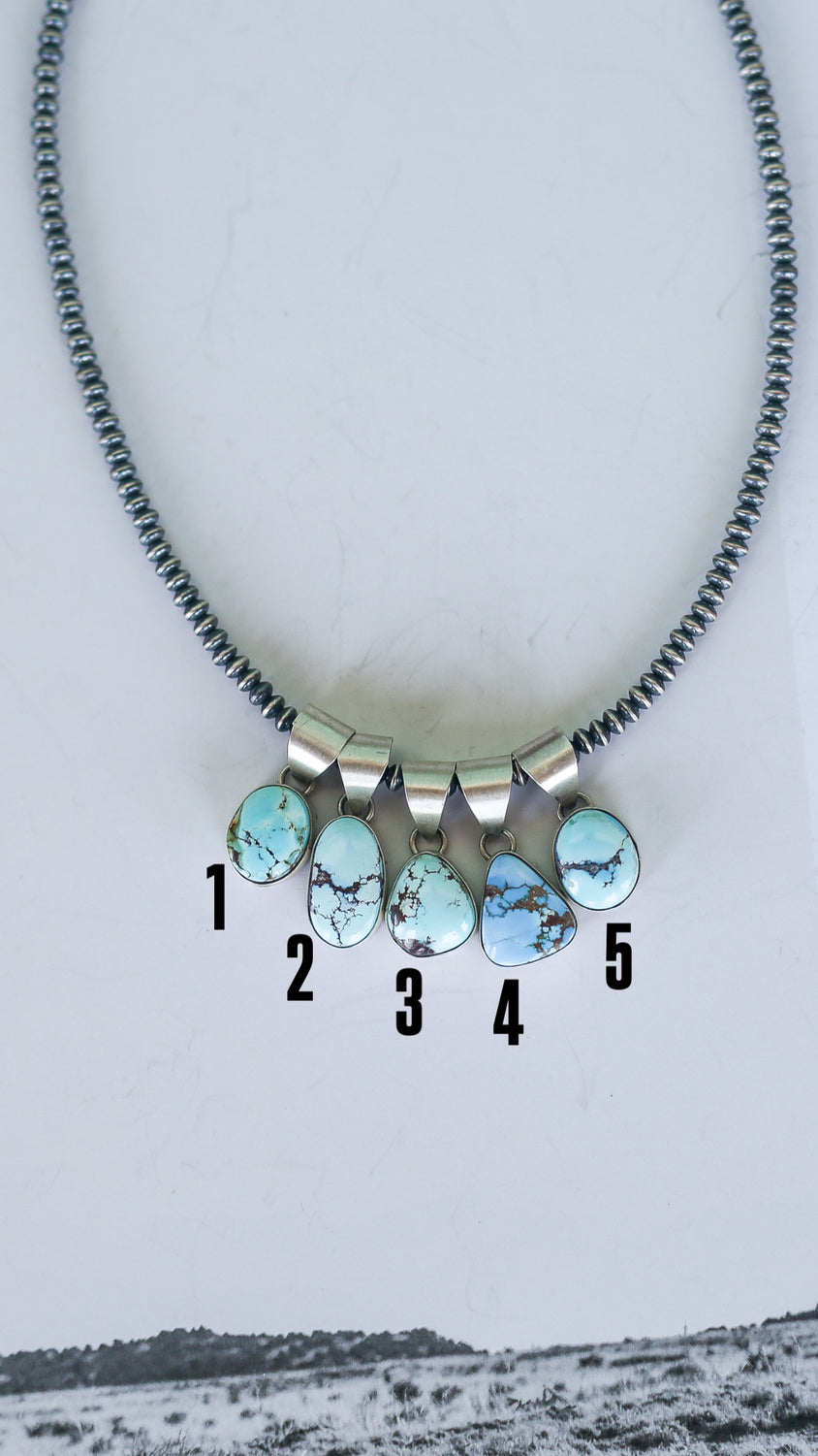 These Pendants come in different stone variations of Golden Hill Turquoise stones and perfect for your collection. They will fit up to a 4mm Navajo Pearl and measure 1 inch from top to bottom. Perfect to add dimension into your stack!