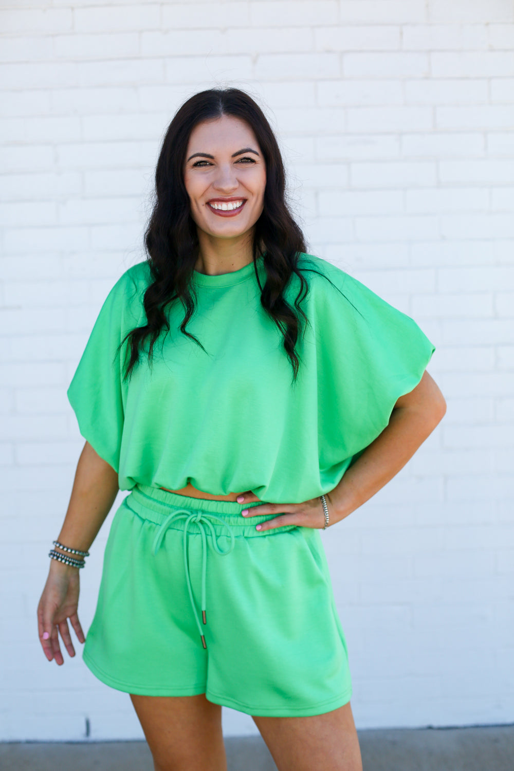 Indulge in the comfort and style of this waist-length bubble hem pullover top, made from a solid jersey knit that is both lightweight and non-sheer. The accompanying high-waisted pull-on shorts, also made from soft jersey knit, feature a drawstring adjustable elasticated waistband and convenient pockets at the sides. Effortlessly chic and versatile, this set is a must-have addition to your wardrobe.