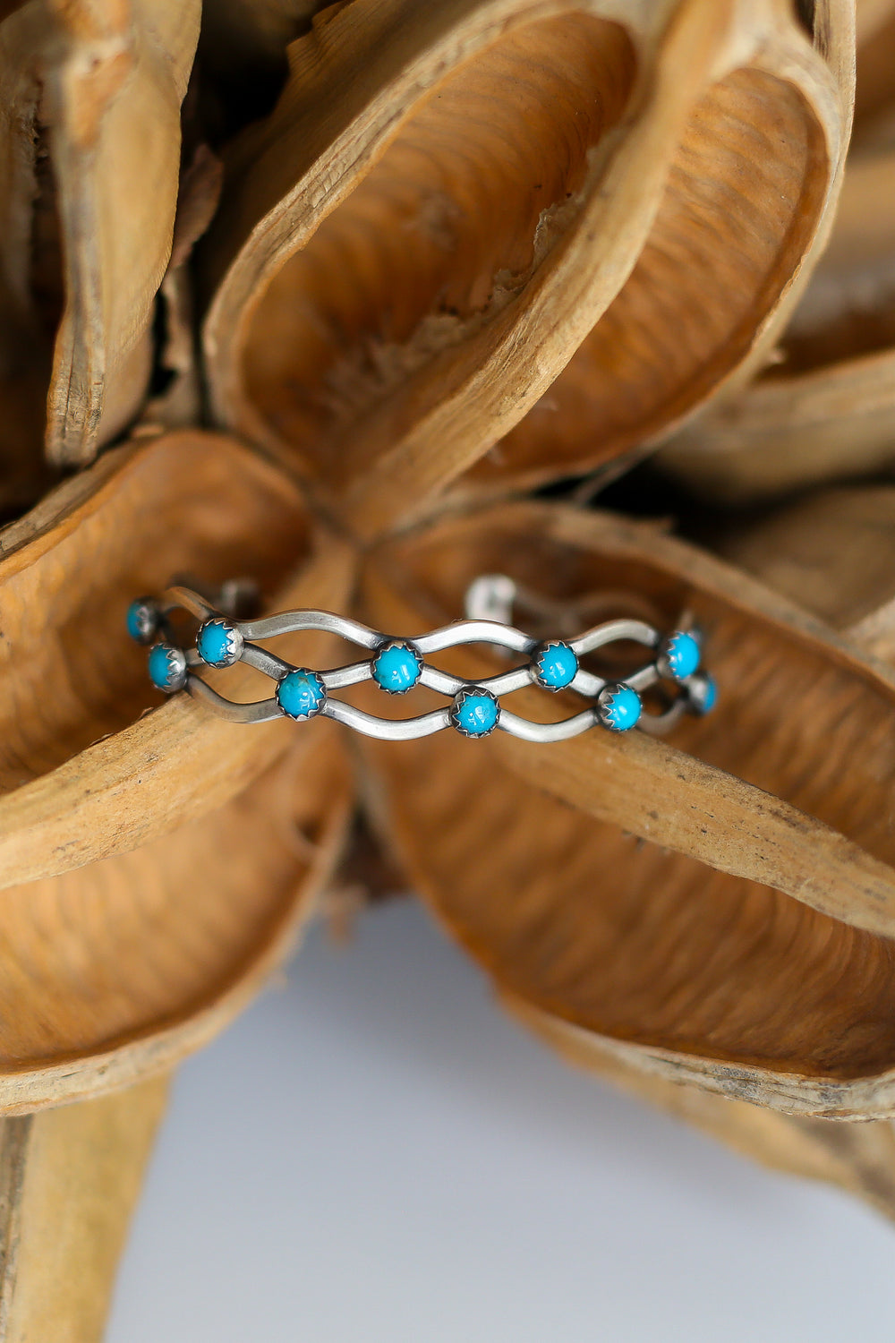 These cuffs are super adjustable. Have "wave" detailing in them. They have Turquoise stones all throughout them. They Measure right at 6 1/4 inches around.