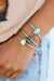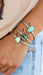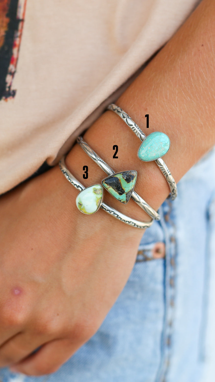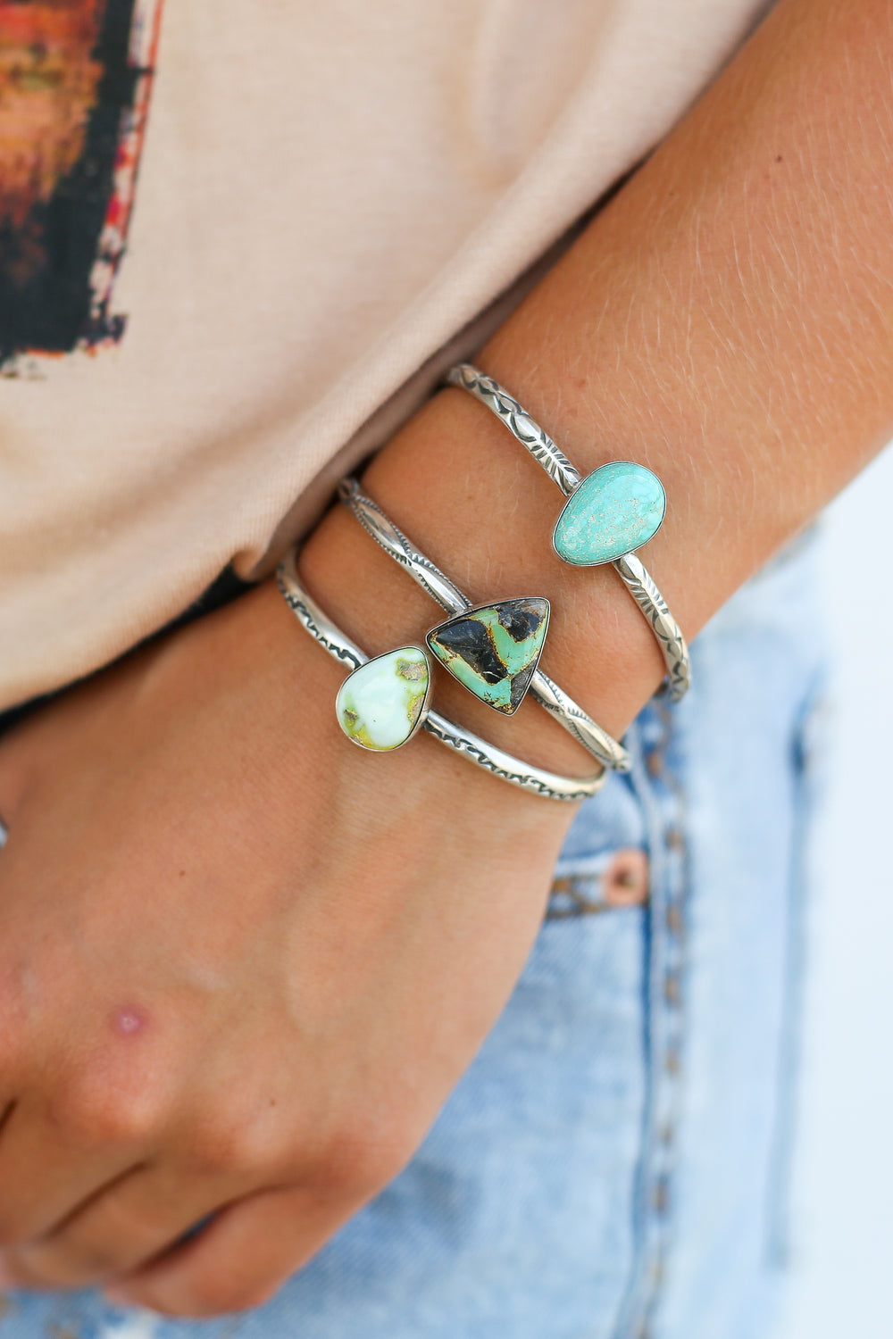 The Single Stone cuff features detailed stamping encircling the band, highlighted by a distinctive stone that sets it apart.