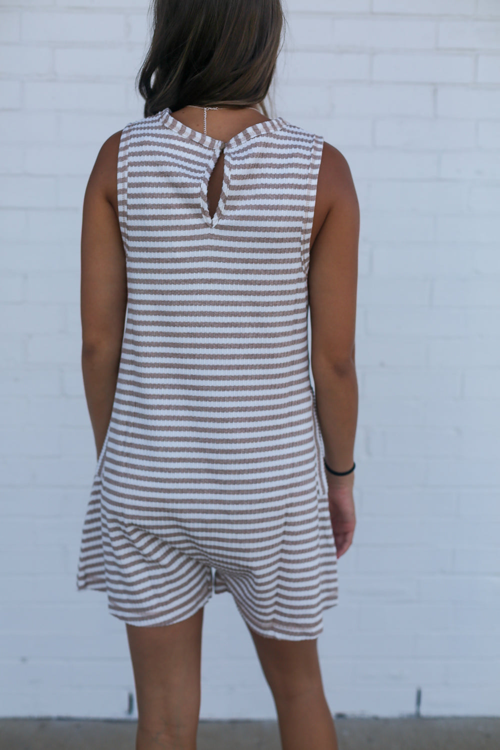 The Taupe and White Striped Tank Romper