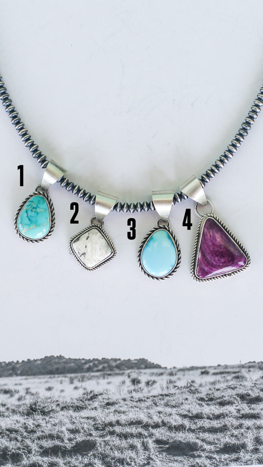 These Pendants come in multiple stone colors and perfect for your collection. They will fit up to a 4mm Navajo Pearl. Perfect to add dimension into your stack! Sizes vary but most are 1 inch from top to bottom.